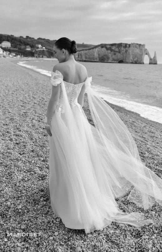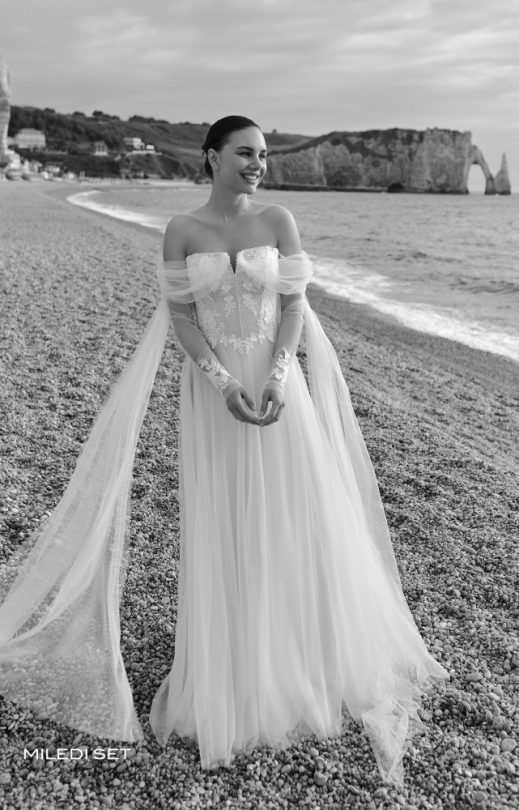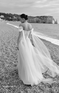Vintage-Kleid aus Tüll. Das Korsett-Mieder ist mit Guipure bedeckt, mit Pailletten bestickt und mit Spitzenelementen verziert. Entlang der Reliefs und entlang der Oberkante des Mieders handgefertigte Stickerei mit Perlen. Mehrlagiger Rock-Sonne. Abnehmbare Tüllärmel, verziert mit Spitzenelementen an verdeckten Knöpfen. Ebenfalls enthalten sind abnehmbare Drapierung – Tüllpelerine mit Schleppe.
