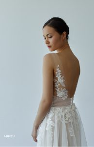 Das A-Linien-Kleid ist aus einer Kombination von Stoffen mit unterschiedlichen Texturen gefertigt: das Oberteil hat dünne Guipure in Kombination mit Kordelelementen, die mit Perlen bestickt sind, der Rücken ist aus transparentem Tüll. An der Taille befindet sich die Drapierung mit handgefertigter Perlenstickerei sowie eine dekorative Schleife vorne. Lagenrock aus Tüll.