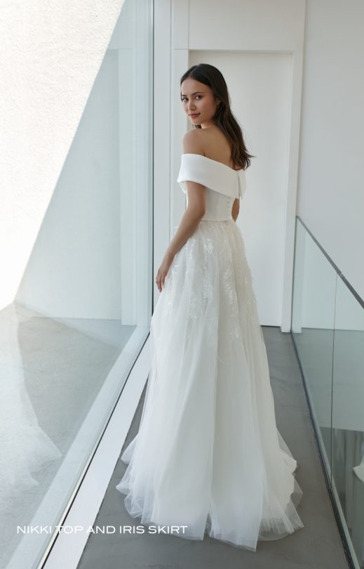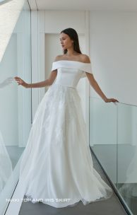 Das Top ist aus Seidenkrepp. Es gibt die Pelerine entlang des Ausschnitts und die Pelerine mit dekorativem Gummizug im Schulterbereich. Auf der Rückseite Verschluss mit Perlmuttknöpfen.