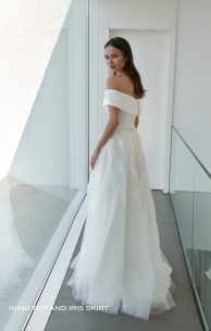 Der Lagenrock aus Tüll ist mit Spitzenelementen, gestickten Pailletten, handgefertigten Stickereien mit Federn und Perlen verziert.Der Tüllgürtel ist mit Pailletten bestickt, der Verschluss ist mit einem Knopf.