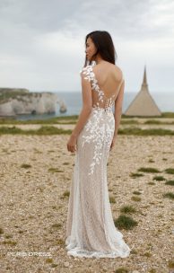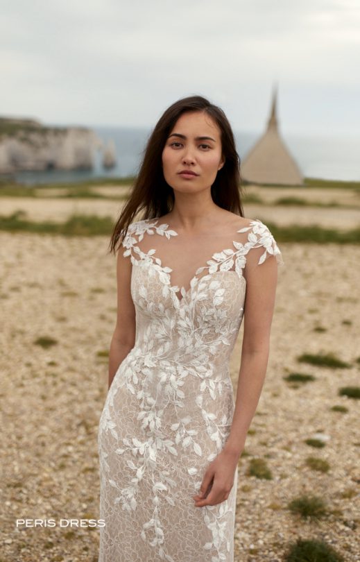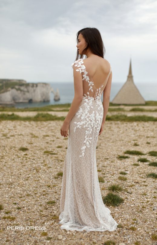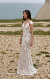 Das Kleid mit Rock-Halbfisch ist aus dünner Guipure kombiniert mit Spitzenelementen. Vorder- und Rückenpasse aus nudefarbenem Tüll. Auf der Rückseite befindet sich eine Schließe mit Perlmuttknöpfen.