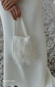 Die Tasche ist aus Crêpe-Satin gefertigt und mit handgefertigter Stickerei mit Perlen und Federn verziert.