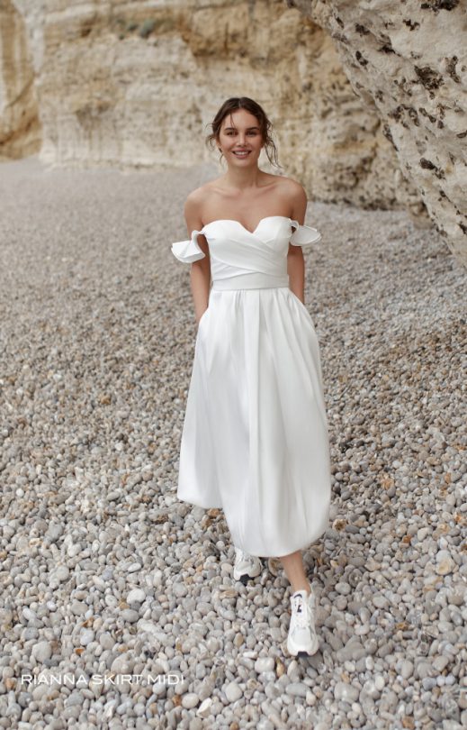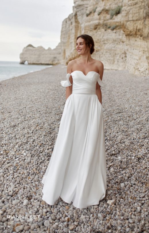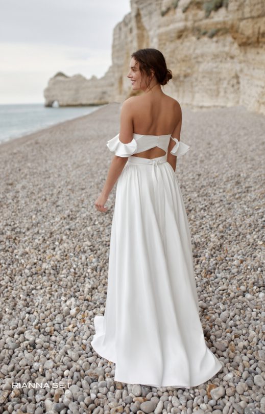 Das Set besteht aus italienischem Jacquard. Das Oberteil hat abnehmbare Träger mit Volants. Bänder an der Taille, die zu einer Schleife gebunden werden. Perlmuttknöpfe auf der Rückseite. Maxirock am Gürtel, mit Falten, Taschen in den Seitennähten, Versteifungsband unten.