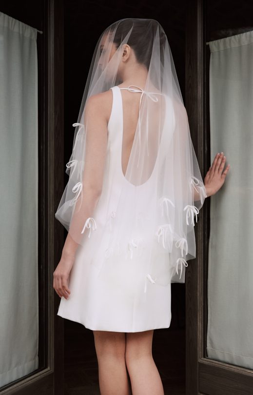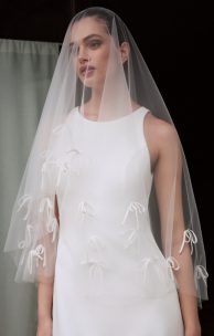 Der ovale Schleier ist aus Tüll gefertigt und mit Chiffonschleifen verziert. Größe: 150×170 cm.