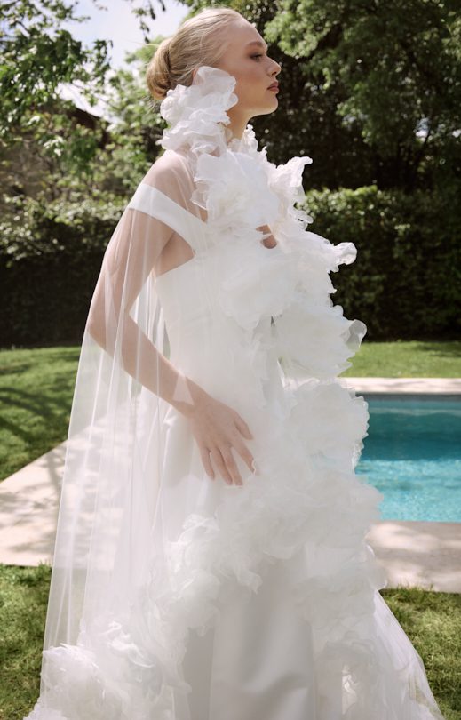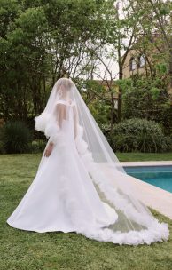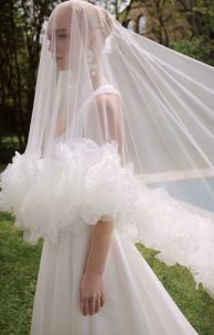 Der Schleier ist aus leichtem Tüll und hat die Maße 150×270 cm. Sein Rand ist mit handgefertigten Blumen aus Organza verziert.