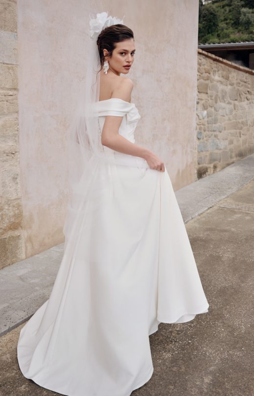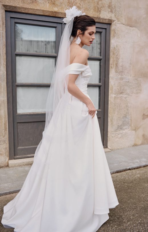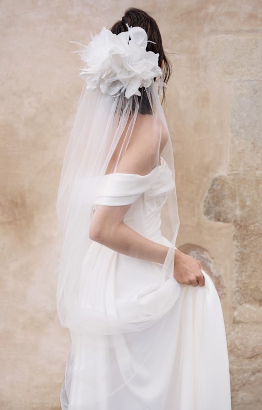 Der Schleier am Kamm ist aus leichtem Tüll gefertigt und mit handgemachten Blumen verziert. Größe: 150×170 cm.