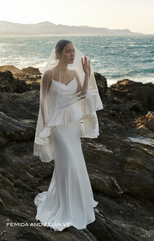 Tüllschleier mit Fransen aus Seidenfäden entlang der Kante wird durch handgefertigtes Stickdekor von den Spitzenborten und Spitzenelementen ergänzt.