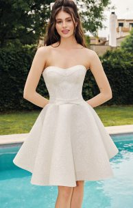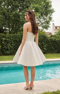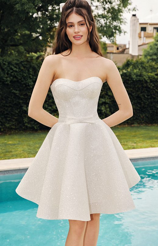 Das helle Kleid ist aus glänzendem Stoff mit Glitzer gefertigt. Das Oberteil ist in Form eines Korsetts mit geformten Unterschnitten gestaltet. Die Rückseite ist mit einem praktischen Reißverschluss und einem innenliegenden Korsett mit Schnürung für eine optimale Passform ausgestattet. Die Taille wird durch einen dekorativen Gürtel mit süßer Schleife betont. Sonnenförmiger Rock.
