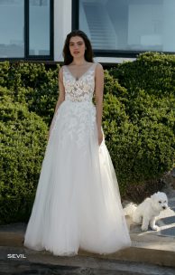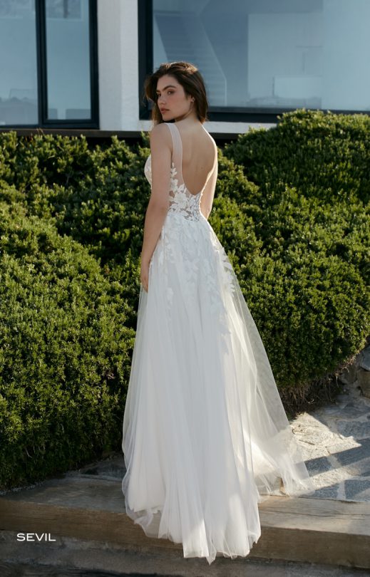 Das Kleid in A-Linie mit mehrlagigem Rock ist aus Tüll gefertigt und mit Spitzenelementen unterschiedlicher Textur verziert: dünne zarte Elemente, die mit transparenten Pailletten bestickt sind, in Kombination mit Elementen, die mit Perlen bestickt sind.