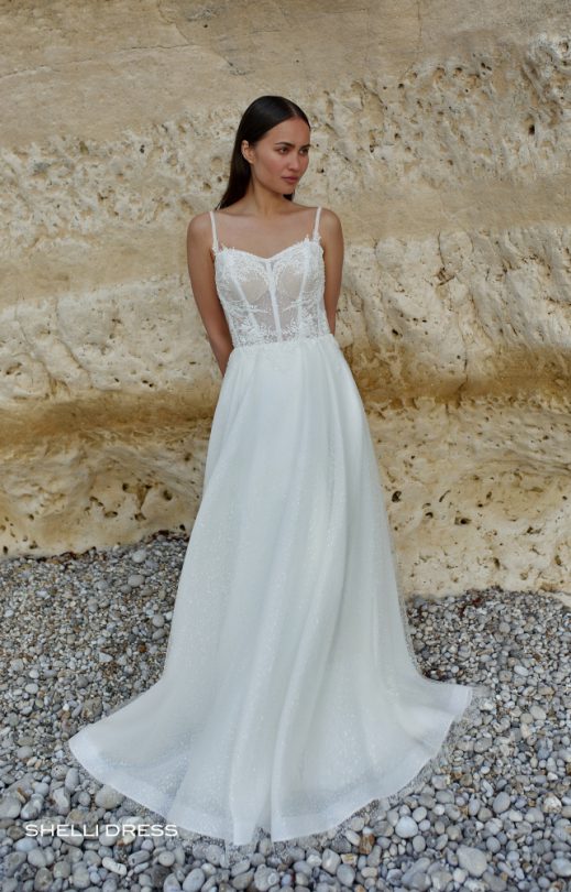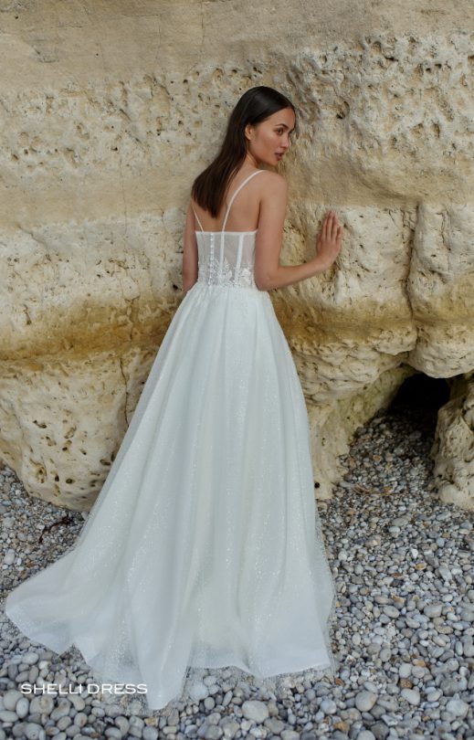 Das Kleid ist aus Tüll mit kleinen Pailletten kombiniert mit Spitzenelementen. Das Mieder ist auf dünnen Trägern, die mit handgemachter Stickerei mit Perlen verziert sind. Auf der Rückseite befindet sich eine Schließe mit Perlmuttknöpfen. Lagenrock mit kleiner Schleppe und Falten an der Taille.
