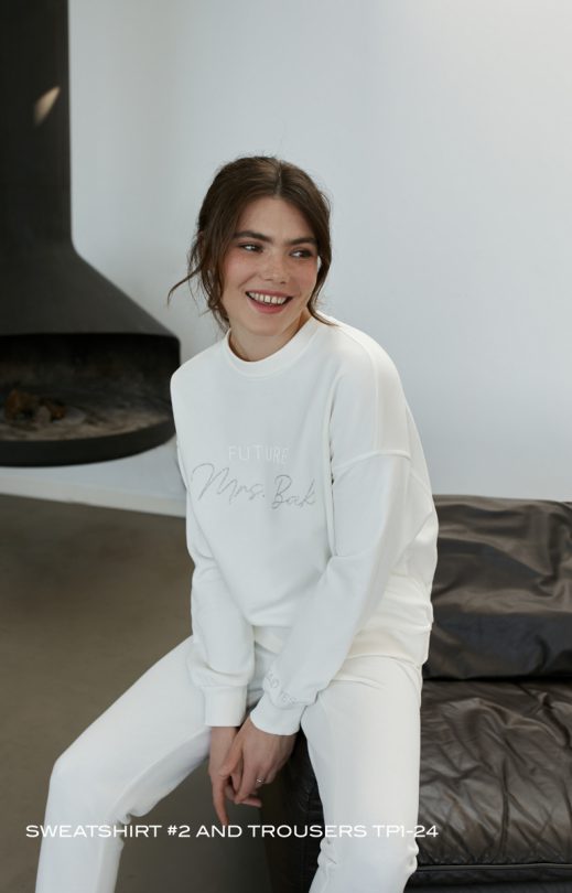 Das Sweatshirt ist aus weichem Jersey. Ärmelbündchen unten, Gürtel unten. Auf der Vorderseite ist ein Aufdruck mit dem Namen der Braut möglich. Auf dem linken Ärmel befindet sich auch ein Aufdruck.