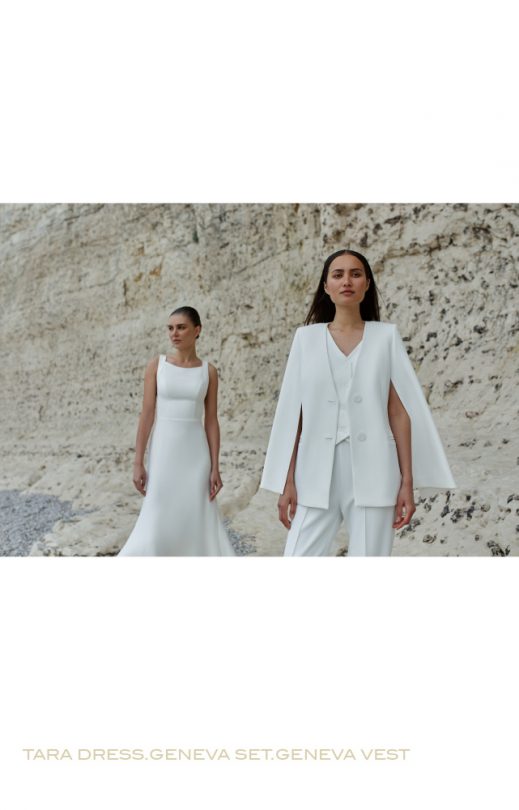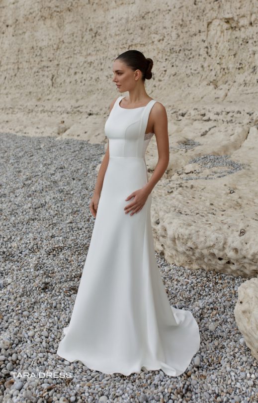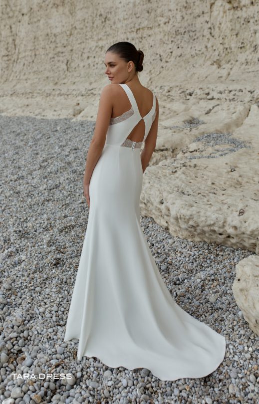 Das Kleid ist aus Crêpe-Satin. Die gemusterte Rückseite ist mit einer Chantilly-Bordüre verziert. Rock-Halbfisch mit kleiner Schleppe.