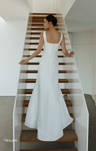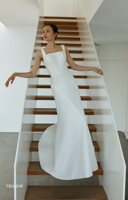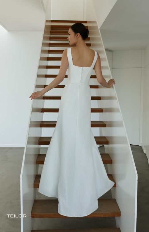 Das Kleid einer angrenzenden Silhouette ist aus italienischem Jacquard gefertigt. Korsett-Mieder mit Perlmuttknöpfen auf der Rückseite. Rock – „Fisch“, am unteren Rand des Rocks befindet sich ein Versteifungsband.
