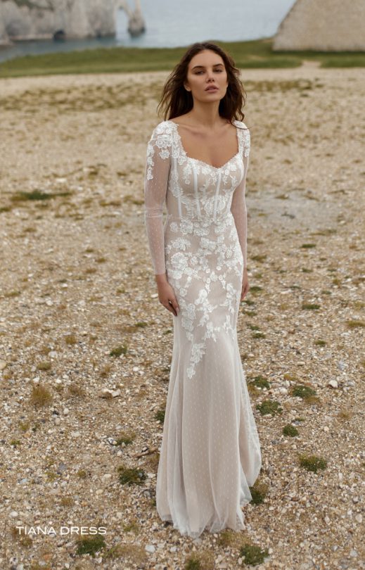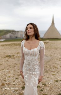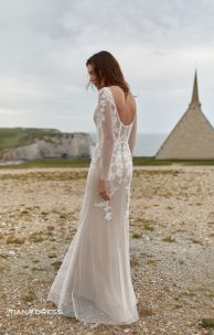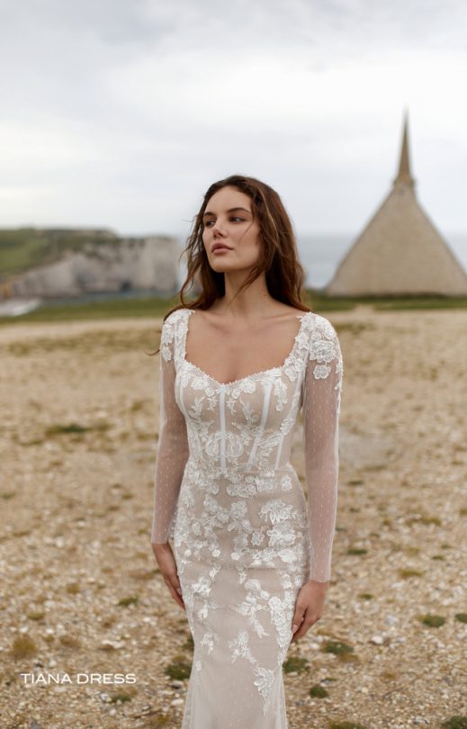 Das Kleid mit engen langen Ärmeln aus Drops-Tüll kombiniert mit Spitzendetails. Das Mieder des Korsetts ist mit handgefertigter Stickerei mit Perlen in verschiedenen Größen verziert. Der Rücken ist transparent, mit einem Verschluss an Perlmuttknöpfen. Rock-Halbfisch.