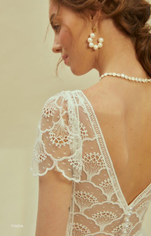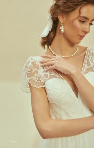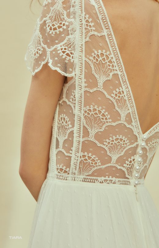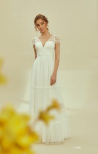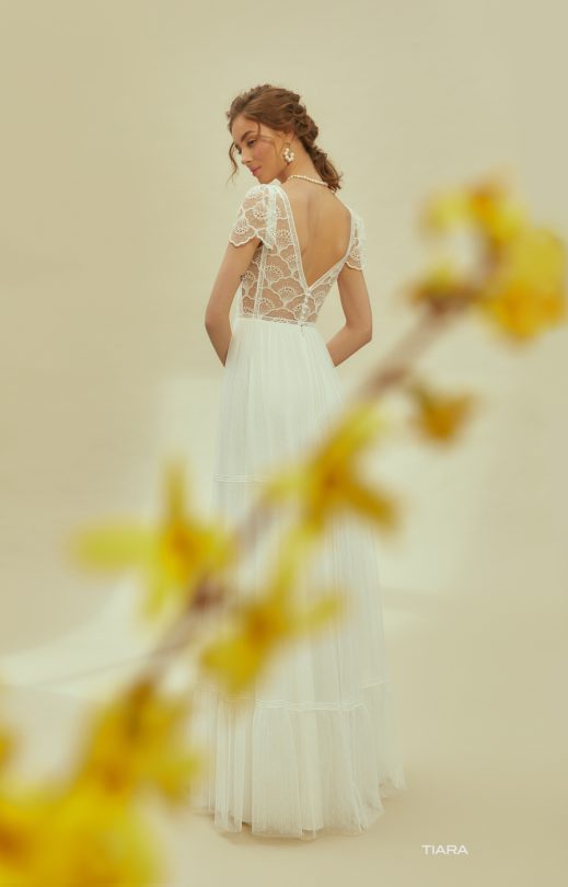 Ein elegantes Kleid besteht aus einer Kombination von Stoffen mit unterschiedlichen, aber ähnlichen Texturen: Das Oberteil besteht aus italienischem Tüll mit Baumwollstickerei und der gepunktete Tüllrock. Das Highlight des Kleides ist der Flügelärmel. V-förmige Schnitte vorne und hinten sind mit einem Spitzengeflecht verziert, das auch die Taille betont. Der leichte Rock ist mehrschichtig, der obere Rock ist mehrschichtig, die Stufen sind durch Spitzengeflechte begrenzt.