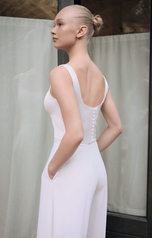 Das Top besteht aus Seiden-Crêpe und hat auf der Rückseite einen Perlenknopfverschluss. Die Länge des Oberteils reicht bis zur Taille.
