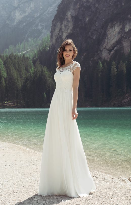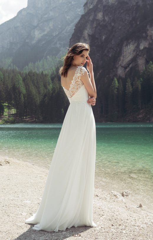 Утонченное комфортное платье спокойного силуэта. Нежный лиф декорирован кордовым гипюром в компаньоне с кордовыми кружевными элементами. Вырез горловины переда-лодочка, линия плеча слегка спущена. На спине изящный V-образный вырез сочетает в себе прозрачную гипюровую часть с нижними непрозрачными деталями, что позволяет выгодно подчеркивать изящность спины. Застежка на спинке-молния в сочетании с жемчужными пуговичками придает особое очарование всему образу. Струящаяся шифоновая юбка имеет сборки по центру спереди и сзади. Данная модель может быть выполнена с завышенной линией талии, что прекрасно подходит счастливым невестам в ожидании ребеночка.