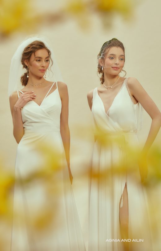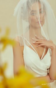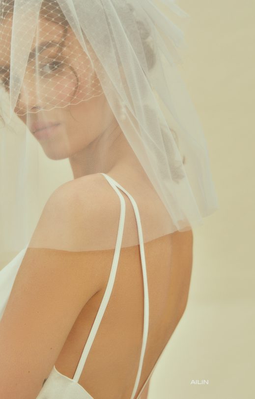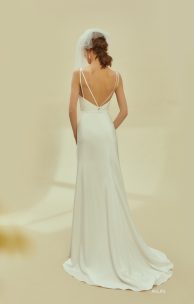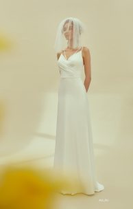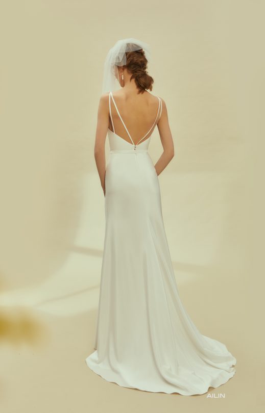 Элегантное шелковое платье силуэта рыбка с небольшим шлейфом. Особенностью платья являются перекрестные бретели и драпировка по переду. Спина с глубоким вырезом и застежкой-молнией.