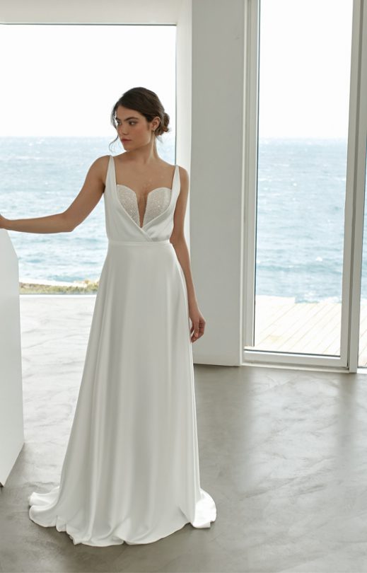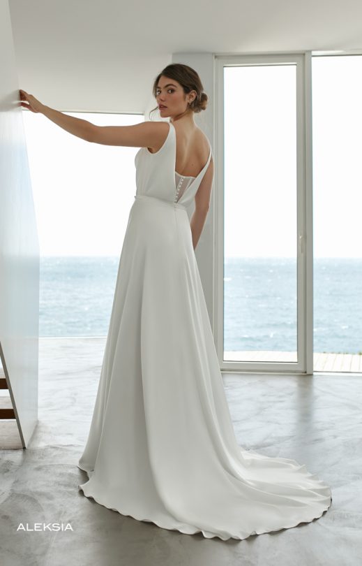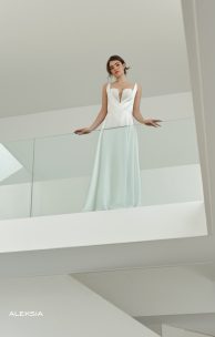 Платье спокойного силуэта выполнено из креп-сатина в сочетании с тюлем, густо вышитым бисером. Лиф-корсет с V-образным клинышком спереди, сзади застежка на пуговички-жемчужинки. Корсет на бретелях, к которым прикреплены мягкие драпировки переда и спинки. Юбка-полусолнце со шлейфом. В комплекте тонкий съемный поясок с пуговичкой-жемчужинкой.