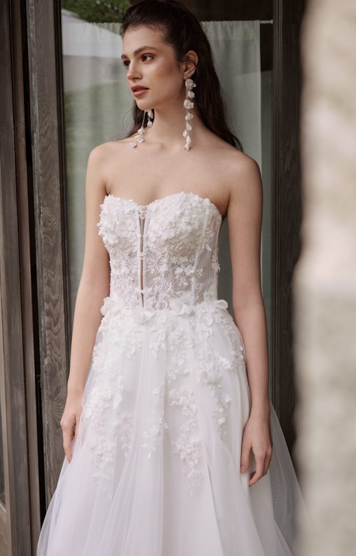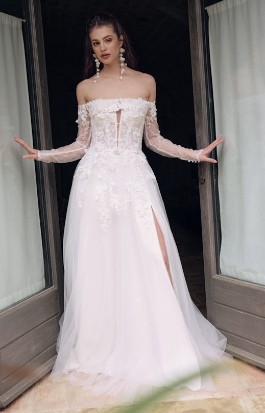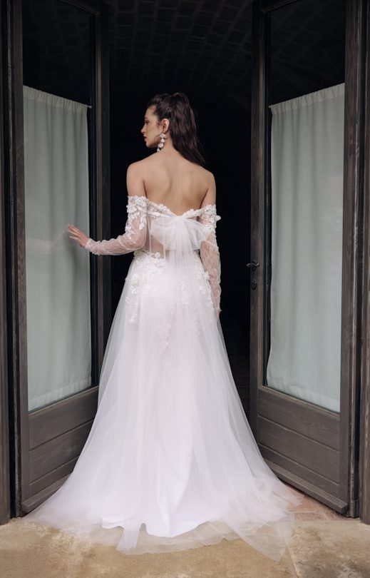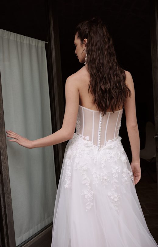 Платье выполнено из сочетания материалов разной текстуры. Лиф в форме корсета выполнен из тонкого гипюра и дополнен объемными кружевными элементами, украшенными бисером и небольшими шифоновыми цветами. Спинка из прозрачного тюля декорирована кружевными элементами и застегивается на пуговицы-жемчужины. Многослойная юбка-солнце изготовлена из тюля с кружевными вставками, с левой стороны дополнена разрезом. Заниженная линия талии на спинке подчеркивает силуэт. Дополнительно в комплекте идет съемное болеро с рукавами. Болеро изготовлено из тонкого гипюра с кружевными элементами. Рукава узкие, длинные, с застежкой на жемчужные пуговицы внизу. Болеро на спинке завязывается на бант с использованием длинных лент из тюля.
