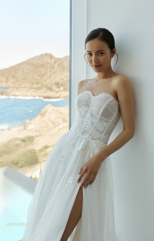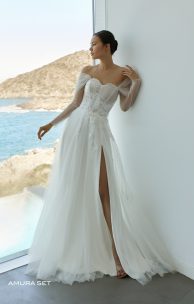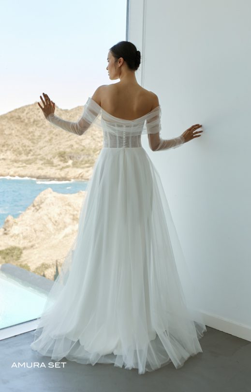 Тюлевое платье с многослойной юбкой. Прозрачный лиф выполнен из сочетания тюля и тонкого гипюра, декорирован хлопковыми кружевными элементами и легкой тюлевой драпировкой. На спинке застежка на жемчужные пуговички. Юбка с разрезом с левой стороны, декорирована кружевными элементами. В комплекте могут быть съемная тюлевая пелерина и митенки.