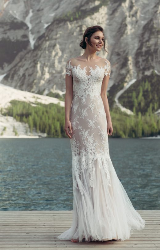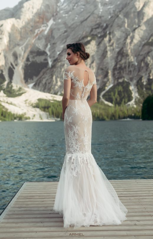 Утонченное платье силуэта «рыбка» выполнено из легкого тюля и тонкого гипюра, дополнененного кружевными элементами. Особый комфорт платью придает приятная к телу вискозная подкладка. Прозрачная кокетка в тон кожи переходит в спущенную линию плеча, изящно обрамленную лепестками кружевных элементов. Фантазийная спинка дополнена оригинальным вырезом в кокетке и застежками на жемчужные пуговички.