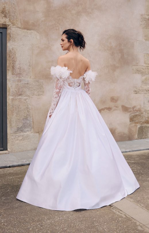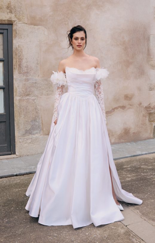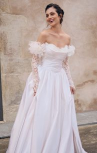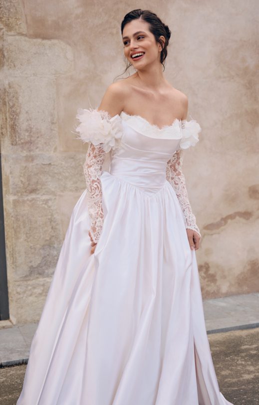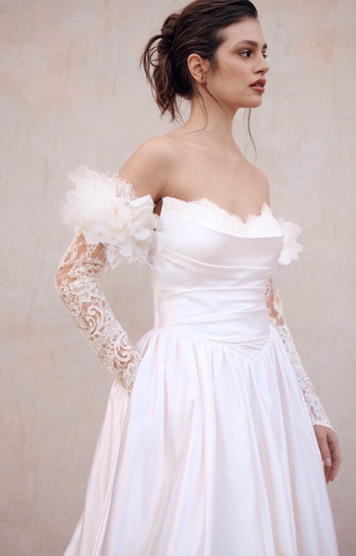 Изящное платье силуэта «принцесса» выполнено из шелкового дюшеса. Лиф выполнен в виде корсета с мягкой драпировкой спереди и удлиненной фигурной нижней частью. На спинке застежка на пуговицы-жемчужины. Внутри корсета предусмотрена удобная резинка на талии с застежкой на крючки. Многослойная юбка с разрезом слева спереди имеет боковые карманы и обработана лентой жесткости для сохранения формы. Средний слой юбки выполнен из жесткого фатина, придающего объем. В комплект входят кружевные митенки из кордового гипюра и съемные украшения на руки с цветами ручной работы, фиксирующиеся на резинке.