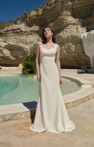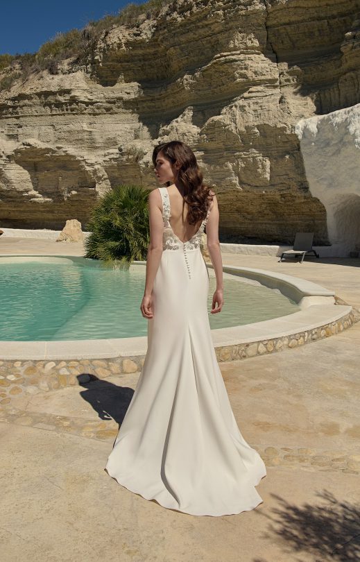 Платье прилегающего силуэта с небольшим шлейфом выполнено из креп-сатина. В боковых швах прозрачные клинышки. Глубокая спинка декорирована цветами ручной работы. Застежка- молния, вдоль которой пришиты декоративные пуговички, обтянутые тканью.