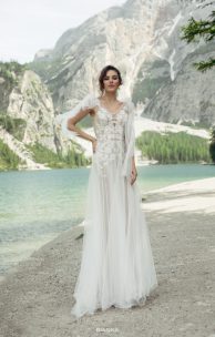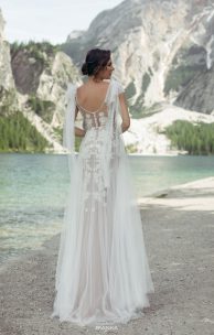 Роскошное платье трогательного силуэта «рыбка» из мерцающего пайетками тюля, богато декорировано кружевными элементами. Интригующие вырезы переда и спинки, изящная талия подчеркнуты вышивкой ручной работы стеклярусом и бусинками. Кокетливость образу придают летящие банты из тюля, которые пристегиваются на кнопочки. Легкая тюлевая юбка-солнце дополняет весь образ воздушности этой модели.