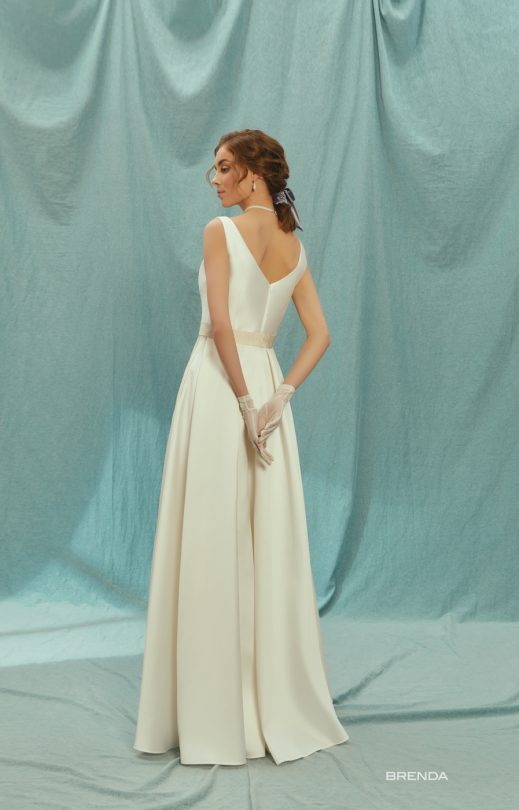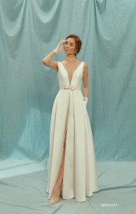 Строгое, лаконичное платье выполнено из микадо. Перед и спинка с V-образными вырезами, на спинке застежка-молния. Изящная талия подчеркнута жаккардовой лентой с декоративным бантиком. Юбка со складками, разрезом по центру переда и карманами в боковых швах.