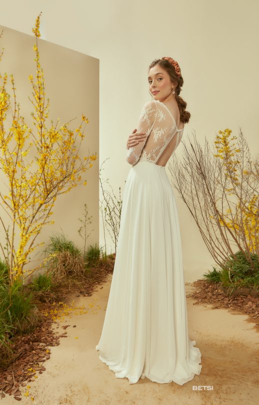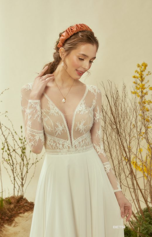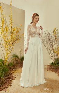 Свадебное платье утонченного А-силуэта выполнено из нежного кордового гипюра, дополненного кружевной ажурной тесьмой. Перед с V-образным вырезом до линии талии, спинка с застежкой на одну пуговичку фигурной формы. Талию подчеркивает кружевная тесьма, имитирующая пояс. Рукав-гипюровый, длинный, выше линии запястья декорирован кружевной тесьмой. Юбка-солнце из шифона.