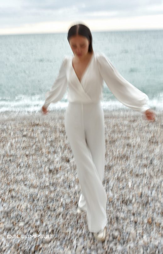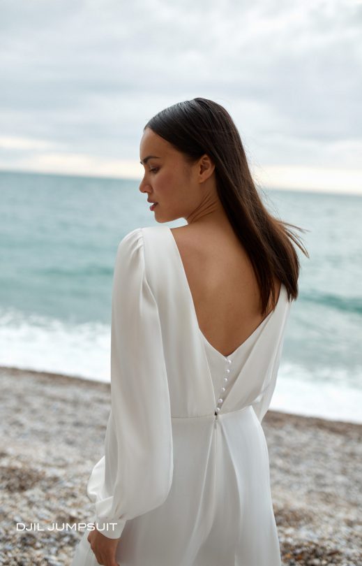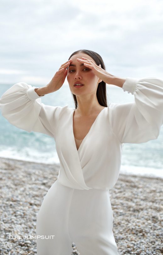 Комбинезон выполнен из шелк-крепа. Лиф с запахом спереди, под драпировкой переда основа из тюля с чашечками. Спинка из шелка с застежкой на пуговички-жемчужинки. Рукав свободный с небольшой сборкой по окату, манжеты с жемчужными пуговичками. Брюки свободные, расклешенные от линии бедра к низу.