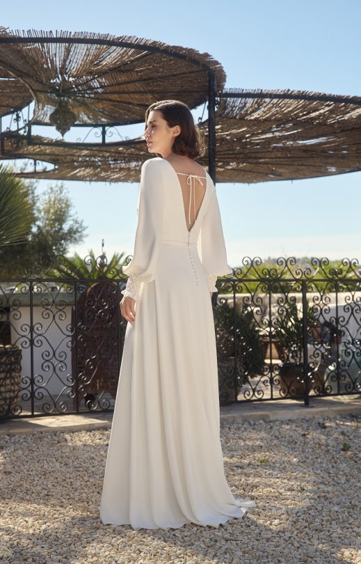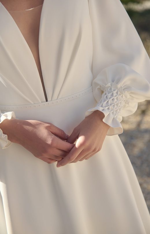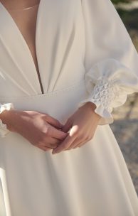 Платье А-силуэта выполнено из вискозного крепа. Перед и спинка с глубокими V-образными вырезами, по переду лифа мягкие складки. На спинке сверху тонкая завязка. Платье застегивается на молнию, вдоль которой пришиты декоративные обтянутые тканью пуговички. Рукав втачной со сборокй в нижней части, драпированный высокий манжет декорирован вышивкой ручной работы мелкими жемчужинками и застегивается на обтянутые тканью пуговички. Линию талии подчеркивает тонкий съемный поясок с жемчужной вышивкой ручной работы.