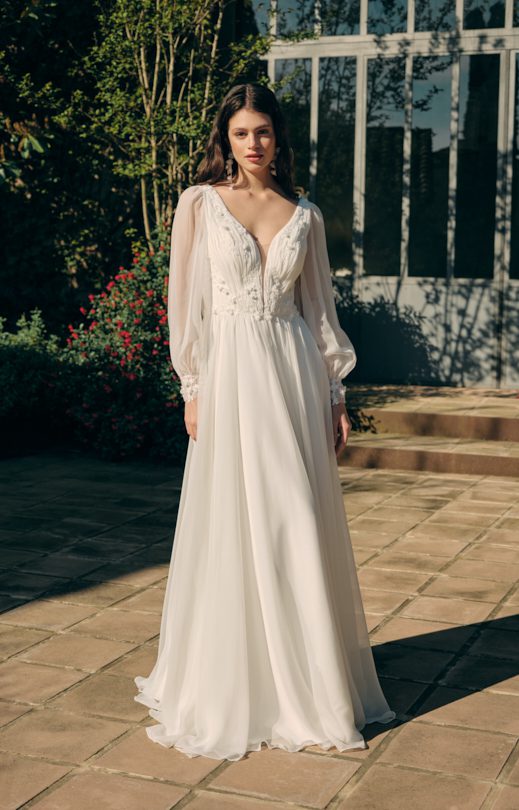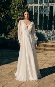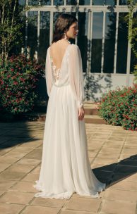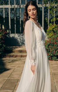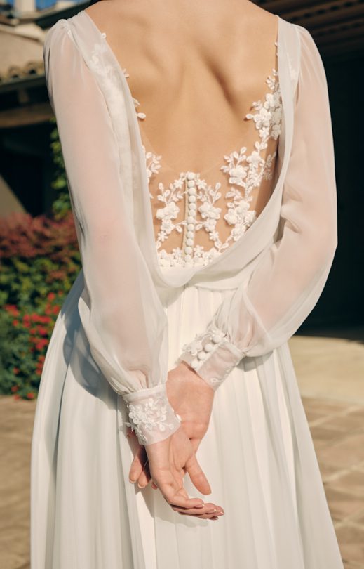 Романтичное платье выполнено из шелкового шифона. Передняя часть лифа украшена мелкой драпировкой и кружевными элементами с объемными мелкими цветочками из шифона. Прозрачная спинка декорирована кружевом и мягкой отлетной качелью, которая пристегивается к линии талии на пуговицы. Застежка на спинке также выполнена на пуговицах. Рукава имеют вытачку и широкий манжет, украшенный кружевными элементами и застегивающийся на пуговицы.