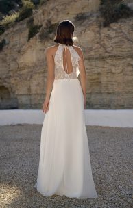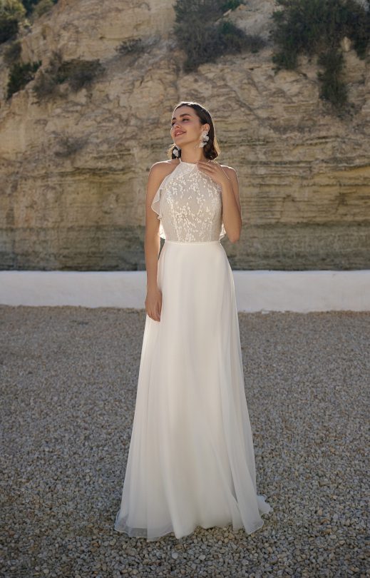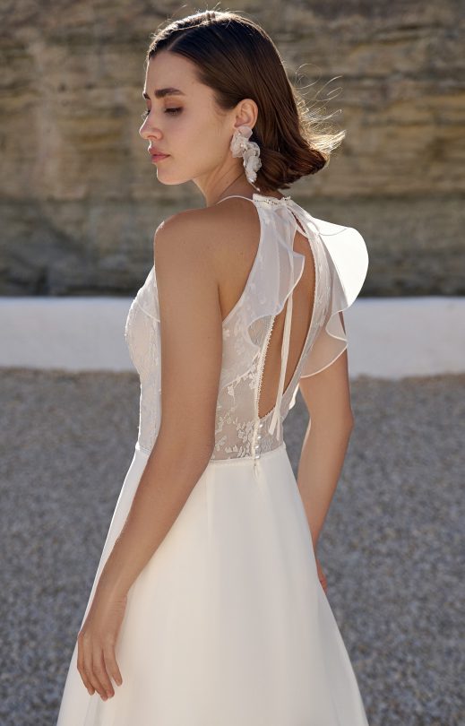 Платье А-силуэта выполнено из тонкого гипюра с нежным принтом на лифе и шелкового шифона на юбке-полусолнце. Перед и спинка лифа-американская пройма, вдоль которой воланы из шелкового шифона, линии вырезов и линия талии декорированы тонкой кружевной каймой. Горловина завязывается сзади тонким шнурочком. Лиф спереди с подкладкой, спинка прозрачная с жемчужными пуговичками.