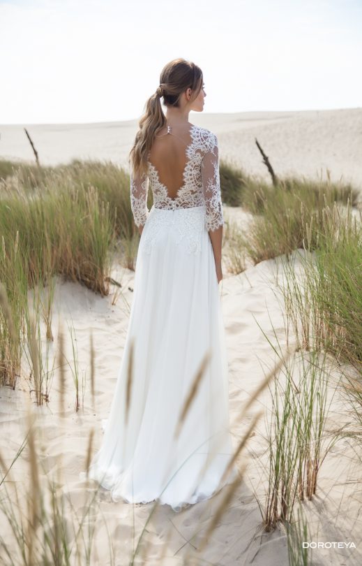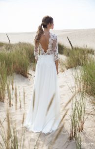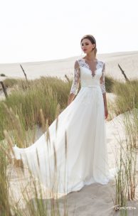 Эффектное платье спокойного силуэта. Лиф покрыт изысканным кордовым гипюром. V-образные линии декольте и спинки имеют нежные ажурные края. Кружевные рукава длины 3/4 и спускающиеся с лифа на юбку кружевные элементы придают особую изящность модели. Женственность линии талии подчеркнута тонким пояском с бантиком.