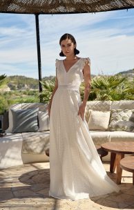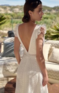 Платье А-силуэта выполнено из хлопчатобумажной ткани в сочетании с декоративной кружевной каймой. Спереди и сзади V-образные вырезы, линия талии подчеркнута широкой прозрачной кружевной тесьмой, сзади застежка на жемчужные пуговички. Юбка шестиклинка. Стыки клиньев декорированы кружевной каймой.
