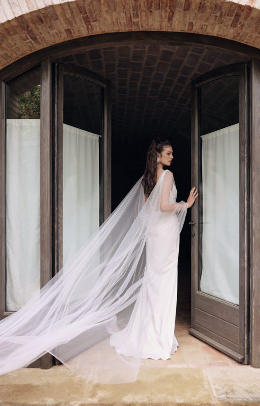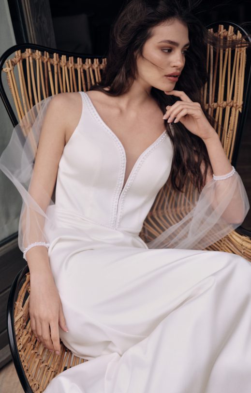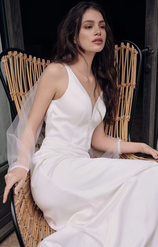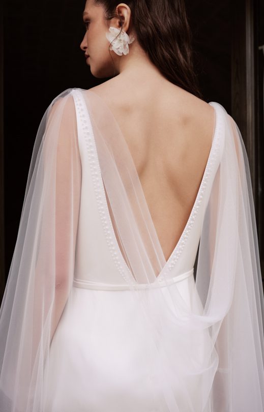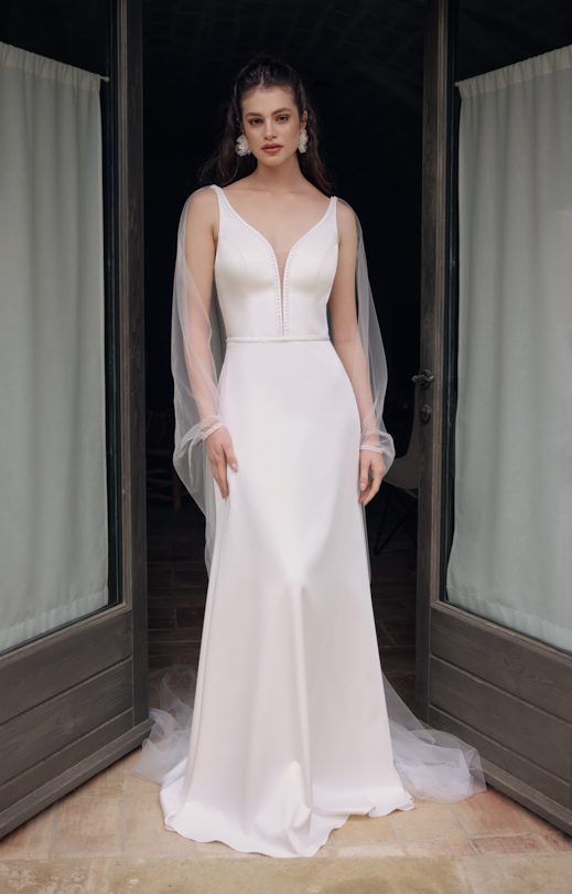 Платье силуэта «полурыбка» изготовлено из атласа люкс. V-образный вырез переда и спинки украшен изысканной вышивкой ручной работы жемчугом различных размеров. Юбка с небольшим шлейфом. В комплекте идет узкий съемный пояс, декорированный такой же жемчужной вышивкой и застегивающийся на аккуратную пуговицу-жемчужину. Съемный кейп выполнен из воздушного тюля. Он пристегивается к платью на кнопки по плечам. Кейп имеет имитацию распашных рукавов, соединенных на запястье пуговицей. Узкие манжеты также украшены ручной вышивкой, создавая гармоничное завершение образа.