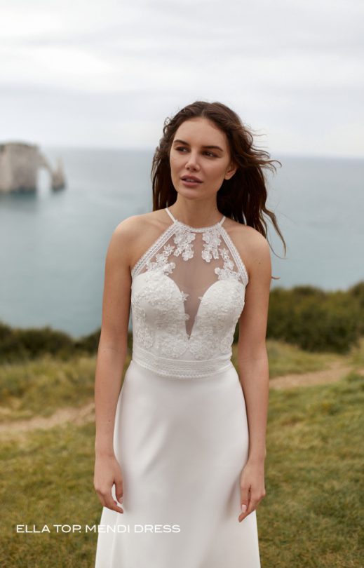 Топ выполнен из тюля без подкладки. Декорирован кружевными элементами с шифоновыми цветочками. Сзади на талии шифоновая завязка на бантик.