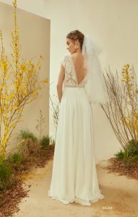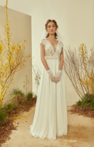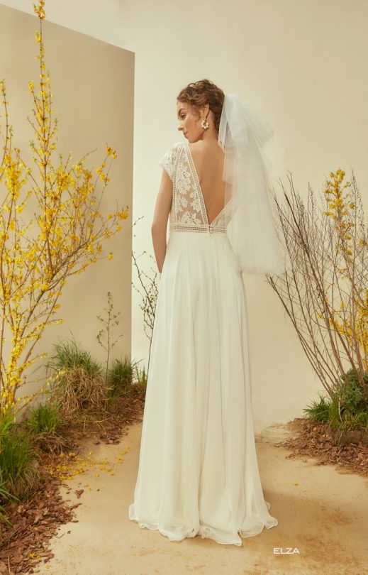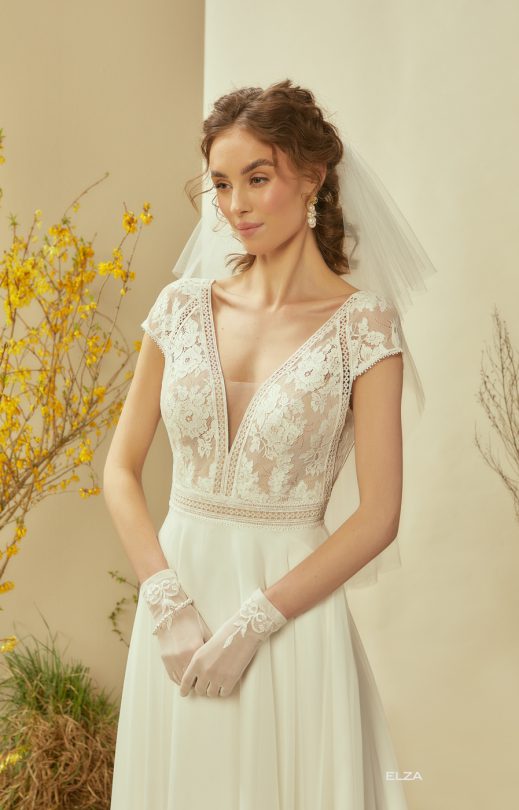 Нежное платье в стиле бохо выполнено из гипюра в нежные букетики, сочетающегося с кружевной каймой. Спереди и сзади V-образные вырезы до линии талии придают особое очарование модели. Короткий рукав-реглан слегка спущен. Струящаяся юбка-солнце выполнена из шелкового шифона.