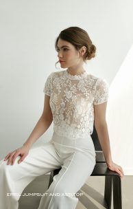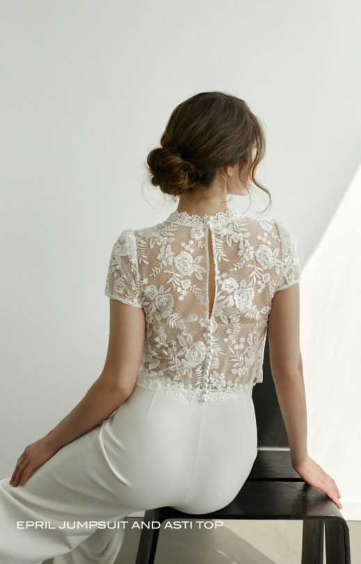 Топ выполнен из гипюра с цветочным принтом, воторничок-стойка из кружевной каймы. Рукав втачной с небольшой сборкой по окату. Подклака топа из тюля, отлетная, по низу кружевная кайма. На спинке жемчужные пуговички.