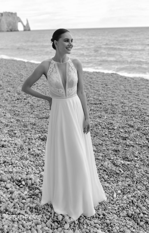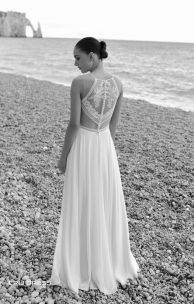 Платье выполненоиз шифона. На лифе тюль в горошек в сочетании с кружевными элементами и кружевной каймой нескольких дизайнов. На спинке жемчужные пуговички. Юбка-солнце.