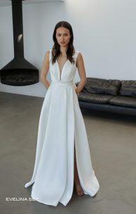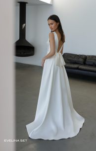 Платье выполнено из микадо. Спереди глубокий V-образный вырез с прозрачным клинышком, мягкие драпировки с глубокими складками. Вырез на спине глубокий. Юбка со складкамипо переду и спинке, с запахом, с карманами в боковых швах. В комплекте съемный широкий пояс, декорированный кружевной тесьмой. Пояс зстегивается на пуговички-жемчужинки. Так же в комплекте пристегивающийся на кнопки к поясу сзади мягкий бант.