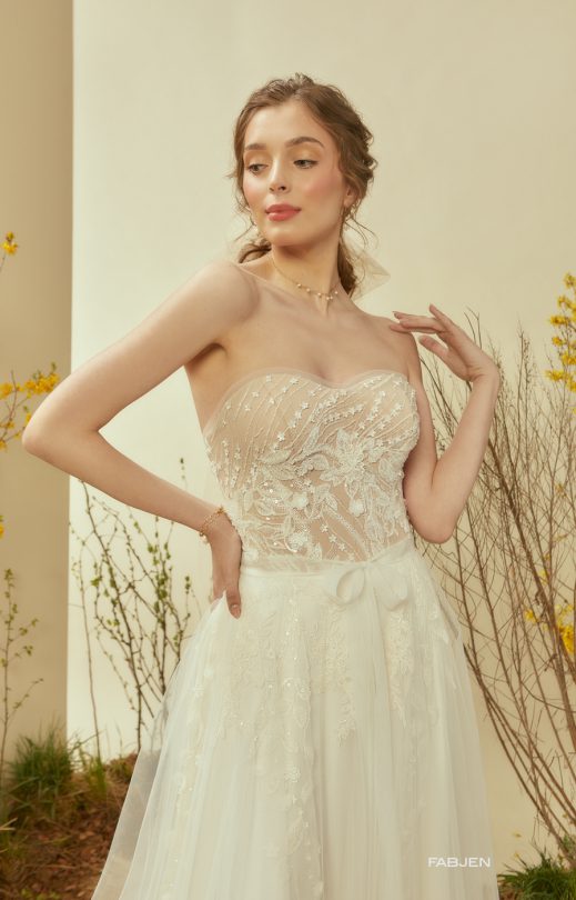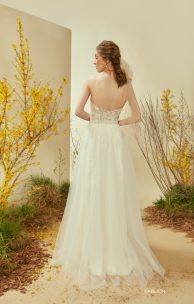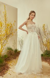 Изысканное платье Х-силуэта выполнено из густо вышитого гипюра. Лиф-трикотажный корсет, по краю лифа нежный тюль, перед лифа дополнен вышивкой ручной работы, повторающей рисунок гипюра. Корсет на молнии по спинке. Многослойная юбка из тюля дополняет воздушный, легкий корсет. На нижнем слое юбки настрочены кружевные элементы с легкой вышивкой пайетками и бисером. В комплекте-съемный тюлевый поясок, завязывающийся легким бантиком.