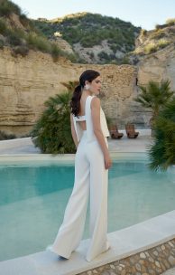 Комплект выполнен из креп-сатина. Топ прямого силуэта с горизонтальной бретелью на спинке с застежкой на пуговички, обтянутые тканью. Горловина-лодочка спереди декорирована цветами ручной работы.Брюки-палаццо на поясе, с высокой посадкой, застежка-молния обработана в боковом шве. Спереди прорезные карманы, на штанинах спереди застроченные вертикальные стрелки.