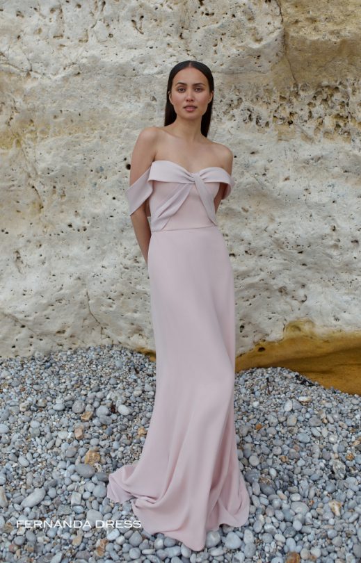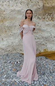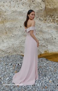 Платье выполнено из искусственного шелка. Спереди вырез кармен с мягкой драпировкой. Юбка-полурыбка с небольшим шлейфом. Тонкий поясок с пуговичкой-жемчужинкой.