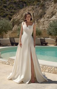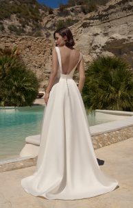 Платье А-силуэта выполнено из микадо. Спереди на лифе квадратный вырез с галочкой, сзади глубокий квадратный вырез, сбоку прозрачные клинышки. Застежка-молния, вдоль которой пришиты декоративные пуговички, обтянутые тканью. Юбка со складками по линии талии, по левой ноге разрез.