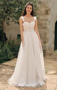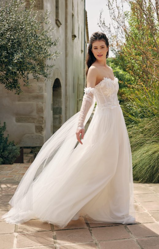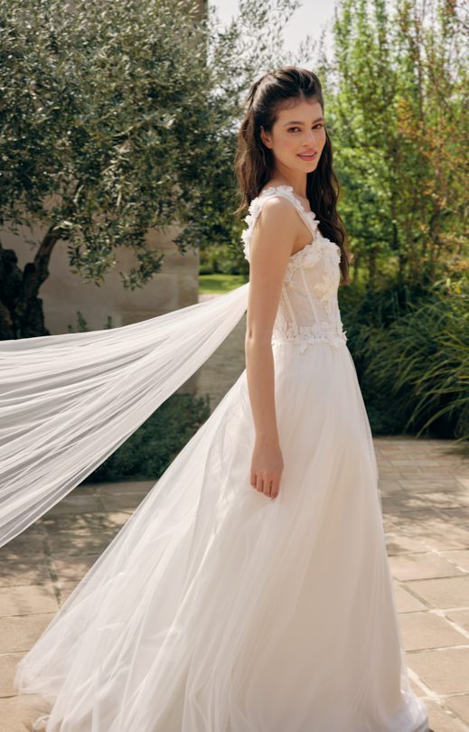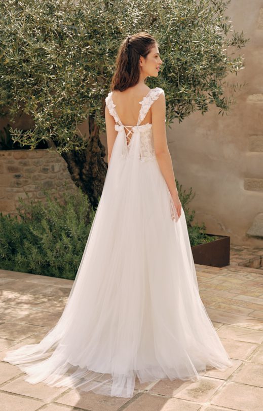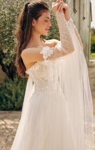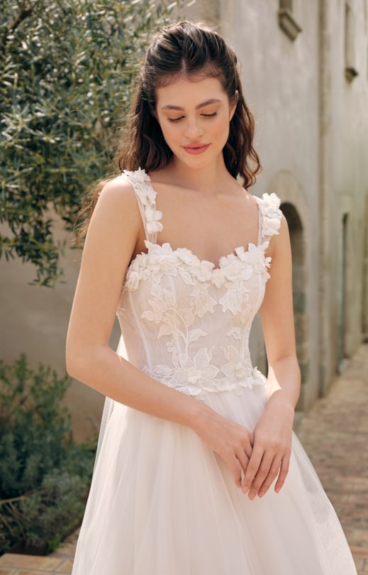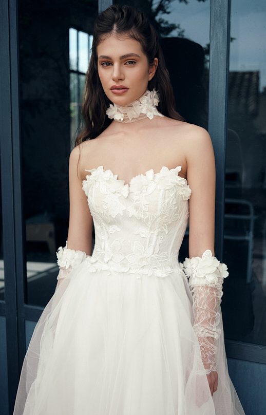 Платье А-силуэта создано из тонкого гипюра в сочетании с кордовыми кружевными элементами и шелковым тюлем. Корсетный лиф, украшенный тонкой шнуровкой на спинке, идеально подчеркивает силуэт. Лиф декорирован нежными цветами, выполненными вручную. Платье дополняет воздушная многослойная юбка из шелкового тюля с мягкой драпировкой по линии талии. В комплект входят бретели, легко крепящиеся на кнопках, из тонкого гипюра с кружевными элементами и цветами ручной работы. Завершают образ рукава-митенки из тонкого гипюра с рюшами из шелкового тюля, украшенные кордовыми кружевными элементами и сделанными вручную цветами.