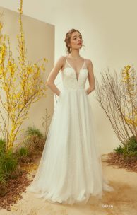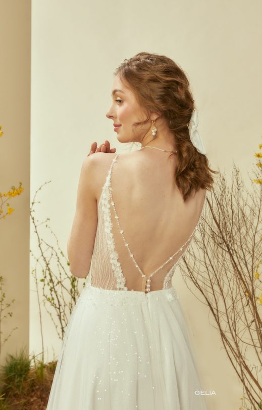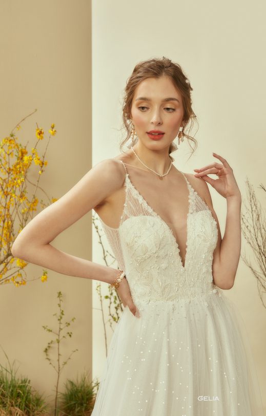 Нежное платье спокойного силуэта выполнено из вышитого гипюра и юбки из тюля. Лиф на тонких бретельках, с V-образными вырезами по переду и спинке. Гипюр дополнен вышивкой ручной работа бисером, бусинками и мелкими цветочками. Спинка также из гипюра со вставкой из прозрачного тюля. Вдоль линии выреза спинки вышивка переходит на бретельку, а также спускается с корсета на юбку. Юбка многослойная, нижний слой из тюля, вышитого пайетками.