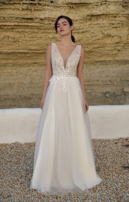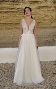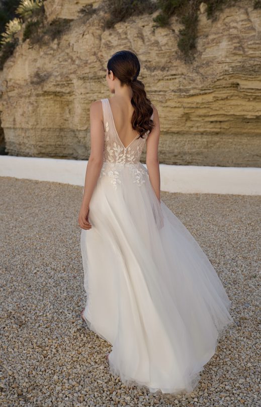 Платье А-силуэта выполнено из тюля в сочетании с гипюром с цветочным принтом. По переду и спинке лифа тюлевые драпировки, в боковых швах-прозрачные клинышки, на спинке застежка на пуговички-жемчужинки. Многослойная юбка-солнце декорирована кружевными элементами.